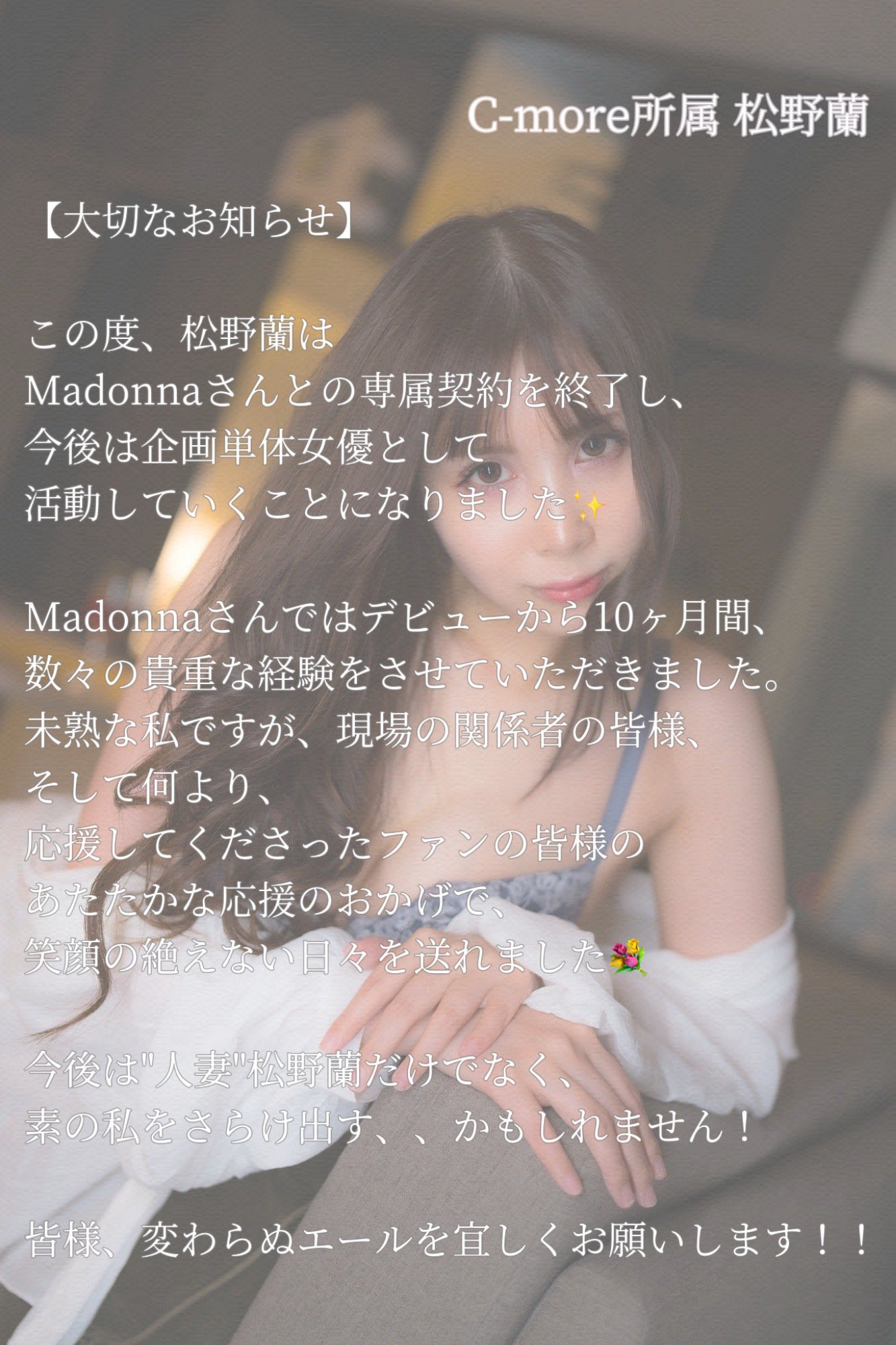 经纪公司C-More所属的女艺人松野兰是在5月21日的时候发文,说自己专属契约终了、结束了与人妻片商Madonna专属合作的关系;接下来呢?她言简意賅,直接说了要以企画単体女艺人的身份继续活动,也就是说ー