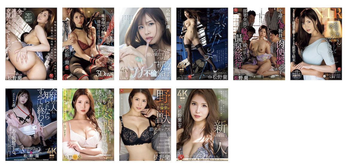 可能有人不认得这位女艺人,容我简单介绍一下:松野兰、经纪公司C-more所属、去年7月出道的御姐系新人,长身(172厘米)、细身(腰围23吋)加上巨乳(H罩杯),看数据就是个身材教科书;然后和大多数于Madonna出道的女艺人一样,松野兰很快就开始拍摄戏剧片并且中出し解禁然后也尝试在抖S和抖M的各种企划找寻适合自己的题材,因为身材真的很棒,所以只要穿上性感妖娆的内衣拍封面照就很吸引人,再加上还没出道就启动社群宣传,看起来是很有大型新人的模样⋯