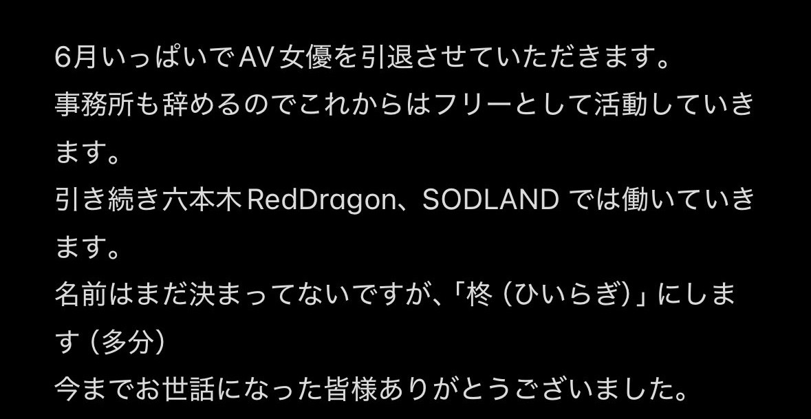 ¼òµ¥·ÒëÒ»ÏÂËýµÄÉùÃ÷£º–°¤æ¤¦¤(–°ÓÅÏ£)˵×Ô¼º½«»áÔÚ6Ôµ׵Äʱºò´ÇÈ¥°¬Þ±Å®ÒÕÈ˵Ť×÷£¬Ò²»áÀ뿪¾¼Í¹«Ë¾£¬½ñºó½«»áÒÔÎÞËùÊô(¥Õ¥ê©`£¬¾ÍÊÇûÓо¼Í¹«Ë¾)µÄÉí·Ý¼ÌÐø»î¶¯£¬»áÔÚÁù±¾Ä¾µÄºìÁú¾Æµê(RedDradon)Åã¾Æ¡¢Ò²»áÔÚSODLand³öϯ»î¶¯£¬ÐµÄÃû×Ö»¹Ã»È·¶¨£¬²»¹ý´ó¸Å»áʹÓÖ°Õâ¸öÃû×Ö⋯