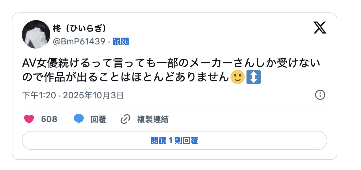 像柊ゆうき(柊优希)的状况就很值得谈谈:可能有人记得她之前已经发表引退声明,不过后来这位刺青女艺人又在社群上解释不是引退而是辞职离开事务所,所以照理来说还是可以拍片对吧?