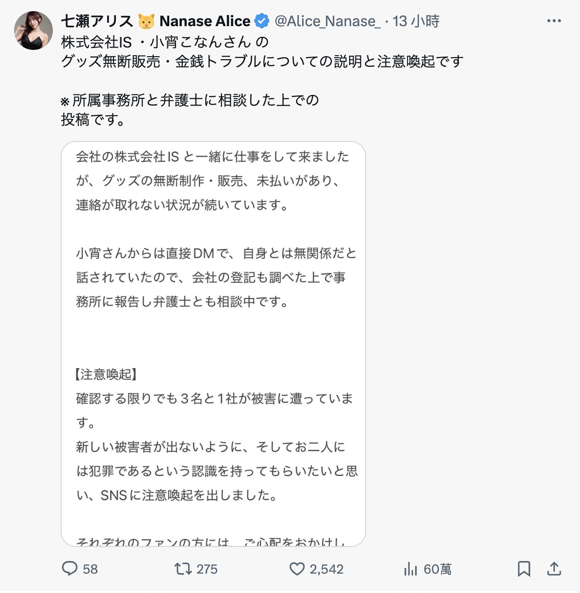 结果七濑アリス(七濑爱丽丝)跳出来证实确有此事,小宵こなん(小宵虎南)确实未经授权发行她的周边商品,事后不但否认参与此事也没有帮忙追回贩售的利润ー而在认定小宵必须负责的同时她也加码爆料,有三位女艺人和一间公司被小宵用同样的手法骗了ー