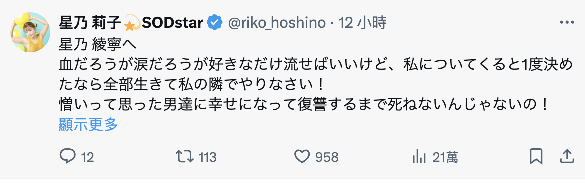 不过还好,在一小时前,星乃绫宁醒了,打了一篇长文和大家道歉,我简单翻译一下: