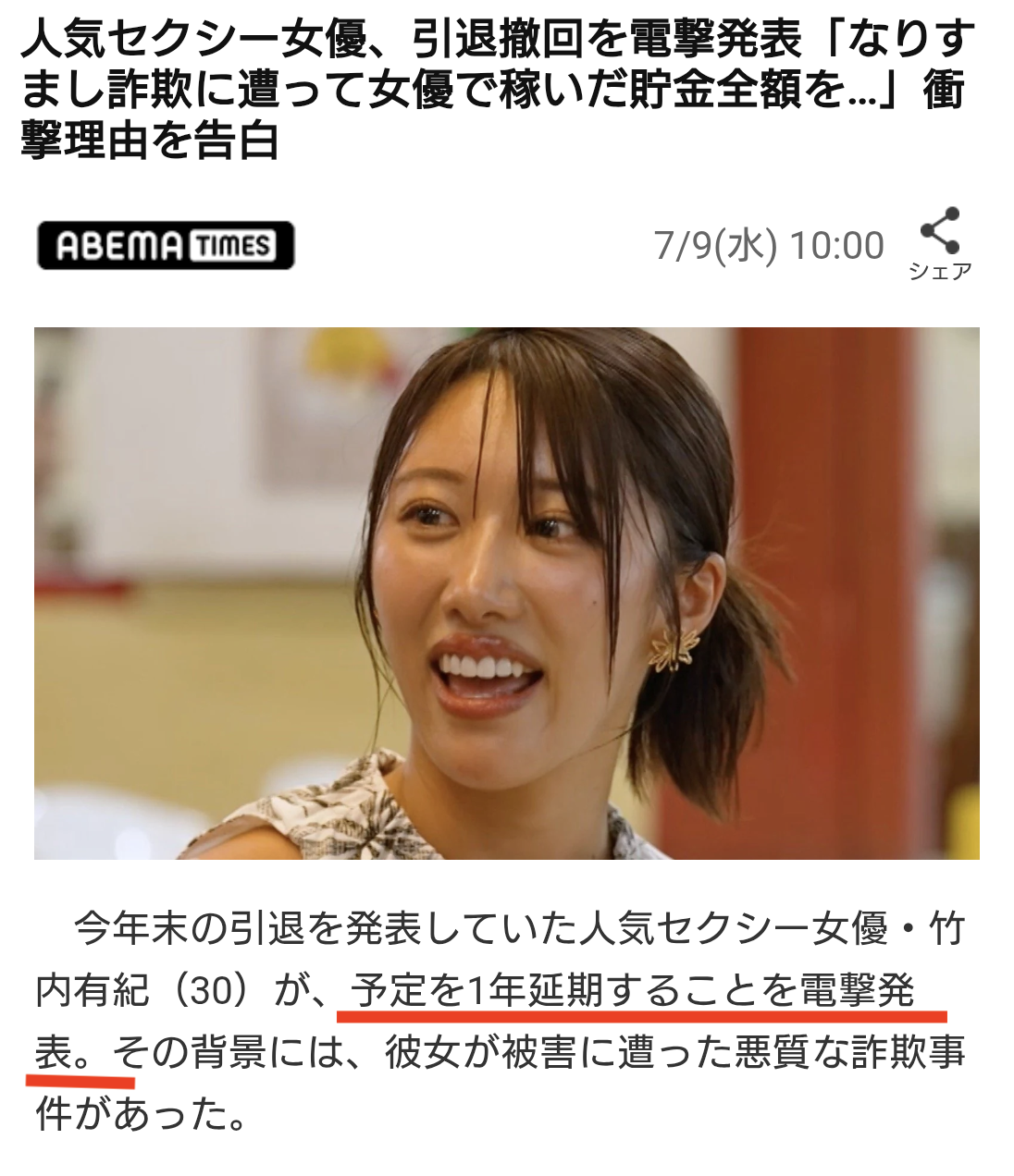 也就是说她的生涯会改成在2026年12月31号画下句点:我想没有人会笑她或酸她,因为诈骗实在太可恶了,尽管假检察官打电话来说你涉入诈骗案必须交出存款以示清白这手法很老套,不过现在的诈骗集团越来越进化,竹内有纪不但被加了line还被知道了本名以及之前居住的地址,再加上在赶行程脑袋没这么清楚所以看法院文后心生恐惧所以中招了,不要说在日本了,最近台湾也出现这样的诈骗方式,当你的名字、地址以及法院的文件一次通通在LINE上面被秀出来时真的很容易被骗⋯